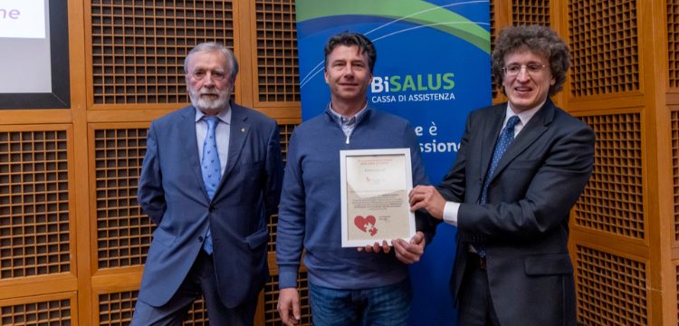 Franco Borlo con Roberto de Rocco che riceve il riconoscimento da Francesco Rossetti di LILT